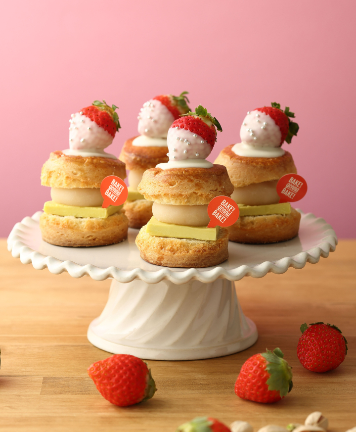 BAKERS gonna BAKEのシグネチャー「バターミルクスコーン」と苺で作る2つのスコーンサンドが、店舗限定で登場。東京ギフトパレットで展開する「ストロベリーキャンドルスコーン」は、甘酸っぱい苺の果肉とホワイトチョコクリームをサンドし、まるごと苺をのせてキャンドルのような見た目に仕上げました。