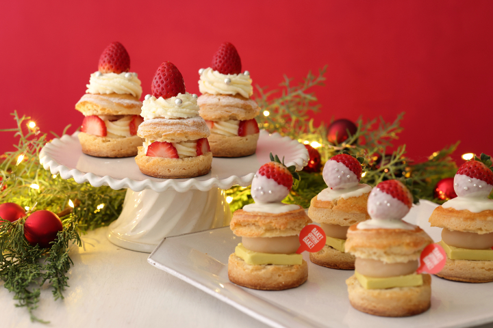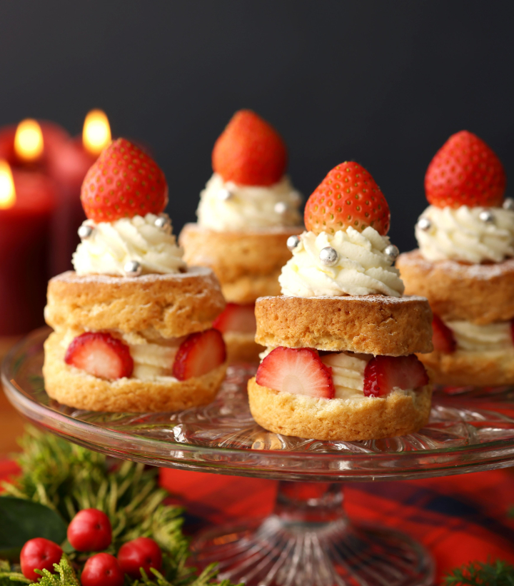 バターミルクスコーンに特製ホワイトチョコクリームをサンドし、ロウソクの炎に見立ててフレッシュ苺をのせたクリスマスのスペシャルスコーンサンド。