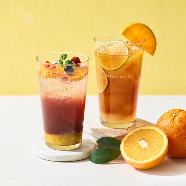 なかでも注目は、オレンジアールグレイの香り豊かなアイスティーを使った2種類の新作アレンジティー。「フルーツエードティー オレンジ&ライム」は、オレンジ果肉、ぷるぷる食感のジャスミンティーゼリー、キリっとした酸味のライムで爽やかに。「オレンジとカシスのティーソーダ」は、オレンジ果肉、ミックスベリー、甘酸っぱいカシスソースでシュワっと大人の味わいに仕上げています。