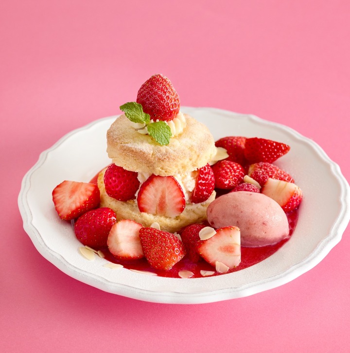 バニラビーンズ入りのさっくりふわっと食感のスコーンにフレッシュ苺、レモンミルクホイップをサンドしました。ストロベリージェラート、甘酸っぱい苺のソースとともに。